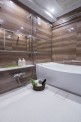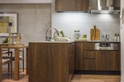 床暖房やミストサウナであったかく心地よい居場所になります。 - 3素材にこだわるダイニングは壁一面のタイル貼りで少し落ち着いた空間に、