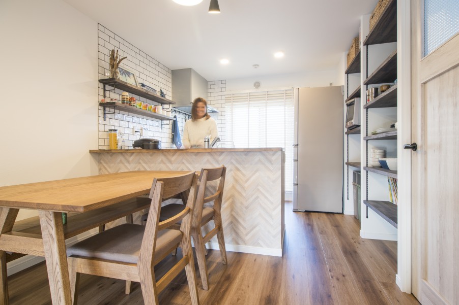 グローバルベイスとの出会いは、たまたまポストに投函されていたチラシがきっかけだったとのこと。「リノベーション済みの物件が売りに出ていたのですが、辻堂のマンションだったので、見学に行きました。木をふんだんに取り入れた内装が本当に素敵で、自分たちが思い描いていたイメージに近かったんです。中でも一目ぼれしてしまったのが、ヘリンボーンの壁です。うちもこんな風にしたい…とイメージが広がりました」(奥様)と当時を振り返ってくれました。
