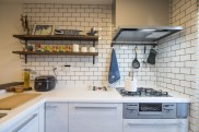 海を感じるものが好きというご夫婦。そういった小物や趣味の本を飾る棚など、見せる収納を随所に取り入れ、まるでカフェのような空間を実現しました。 - 2家族との対話を楽しみながら、作業をすることができるL型のキッチン前の家は炊事をしていると孤立してしまう間取りだったんですが、このキッチンなら家族との対話を楽しみながら、作業をすることができます。白を基調にした壁面も清潔感がありますし、掃除も楽で、とにかく使いやすくて、とても気に入っています