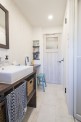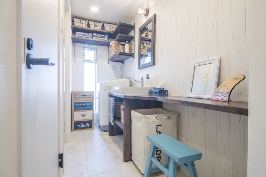 - 3家族の人数が多くても使いやすそうな工夫75m2弱の物件は大きな間取り変更はしていないのですが、家族の人数が多くても使いやすそうな工夫も感じられます。例えば、朝の忙しい時でも、みんなで身支度をスムーズに洗面所は横一列に並んで使えるように、棚の部分が横長になっています。