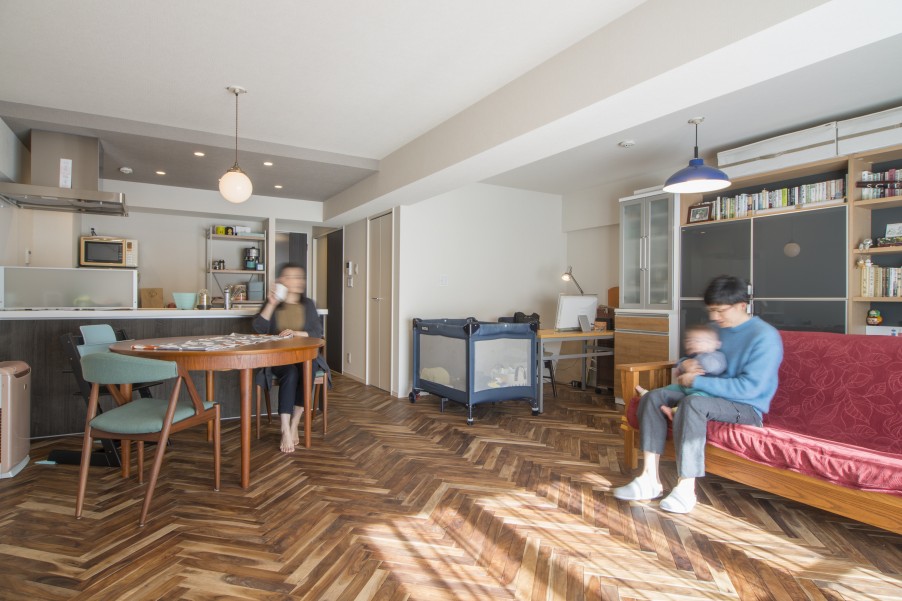 - 1物件探しのきっかけを教えてください。子どもの誕生をきっかけに家探しをスタートしたNさんご夫妻。グローバルベイスとの出会いは、以前に住んでいた賃貸住宅にオープンルームのチラシが入っていたのがきっかけだったそうです。お二人のこだわりは、これから増える家族のために、とにかく広い部屋が欲しいとのことで、オープンルームは希望よりも狭かったのですが、そこで出会った担当営業から「すぐ近くにこれからリノベーションする物件がありますよ」と言われ、案内されたのが現在のお住まいだったそうです。