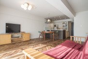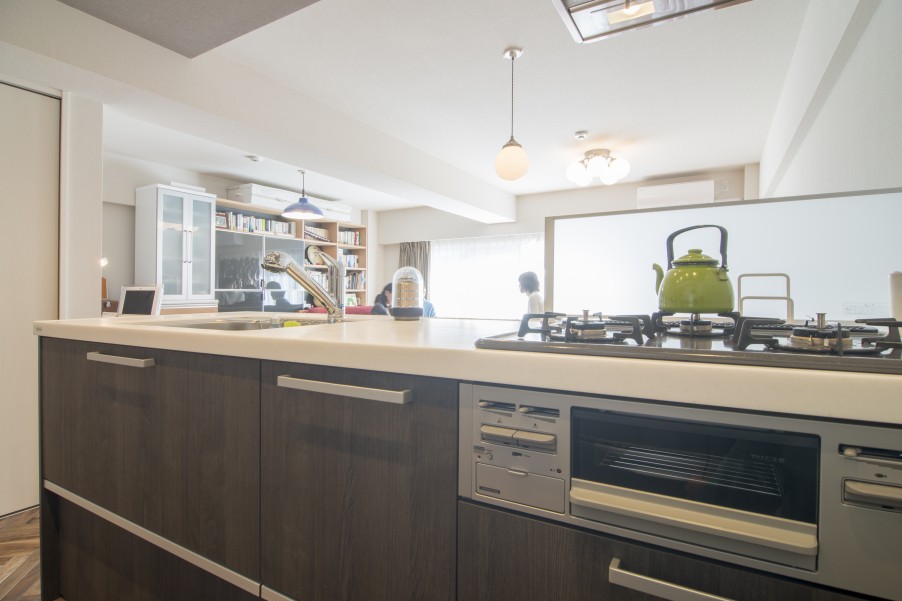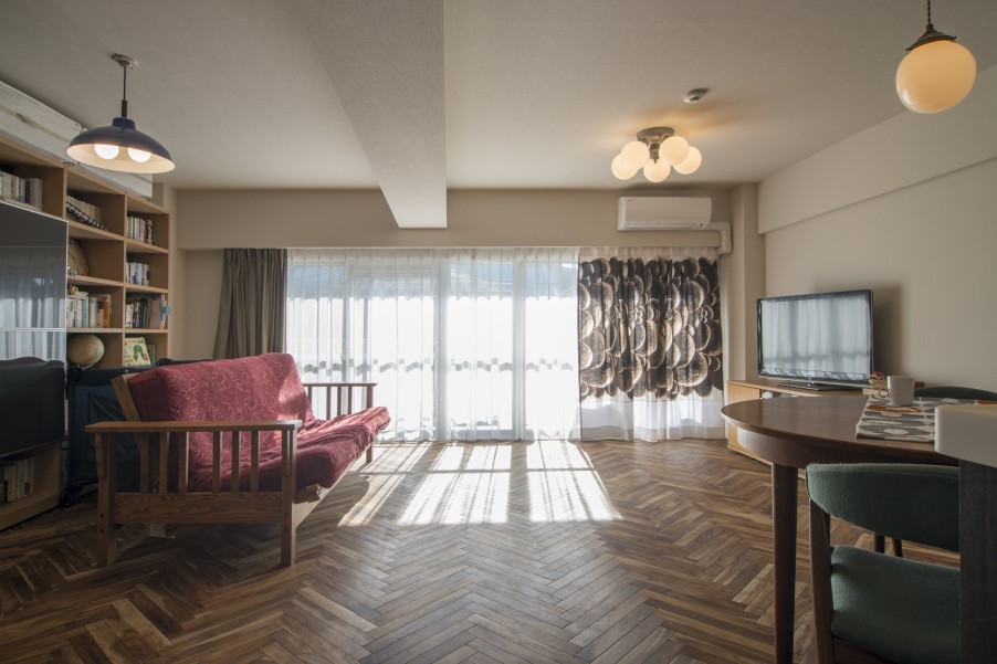 「そうそう、もう1つ条件としてあげたのが、フラットな壁があることです。たくさんの本を所有しているので、それを収めるための大きな本棚が収めるためです。出窓があったり、梁や柱でカクカクしていると、大きな本棚が置けないので、そういう部屋は除外して考えていました。実は、手持ちのテーブルやソファーと言った家具も、若干大きめなんですよ。だから、それらを置いても余裕がある部屋、ということで広さを求めていたんです。実は、このLDKも2部屋にわかれていたんですが、壁を取り払って、広々としたLDKにしてもらいました。そういうオーダーができたのも、この部屋に決めた大きな要素です」(ご主人様)。それとキッチンの天井の色をアクセントで変えてもらったのですが、そういう細かいオーダーができたのも、良かったと思っています」と、リノベーションへの満足度の高さを話してくれました。