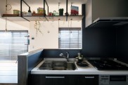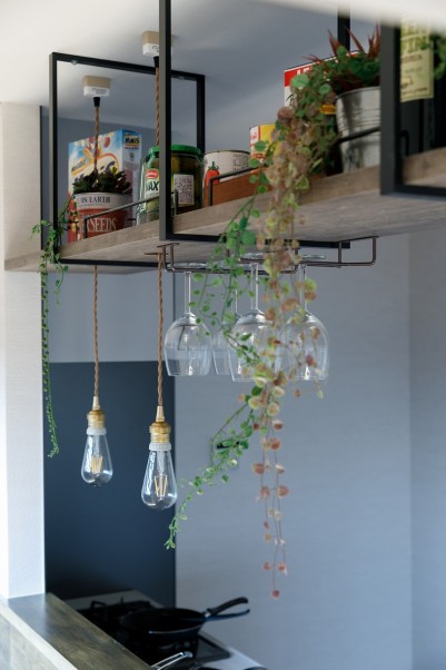 - 1見せる吊り収納でキッチンを楽しくフレーム金物のシンプルな仕上げにも関わらず、空間の間仕切りとしても重宝。解放感を保てるデザインです。