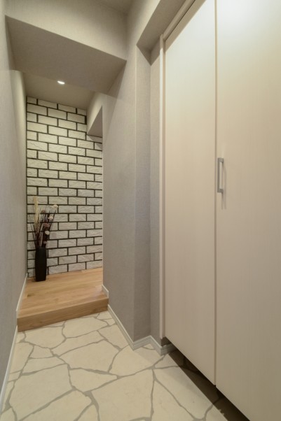 LDKの白いレンガをはじめ、キッチンのモザイクタイルや玄関のタイルは南欧を彷彿させるようなデザインになっています。