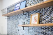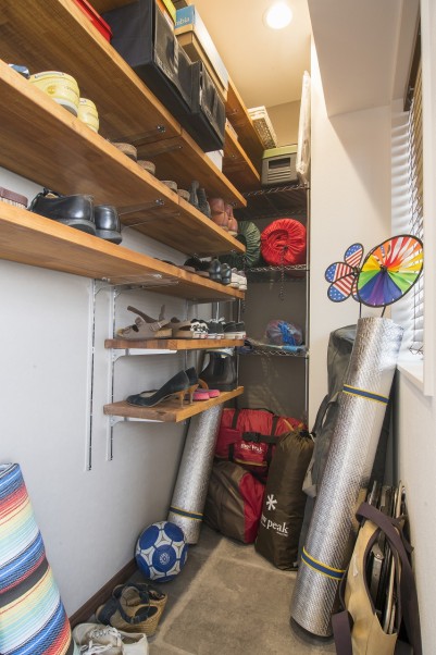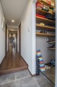 一番こだわったのが、玄関入ってすぐ右にある収納スペース。キャンプが趣味なので、その道具を収納できる場所が、どうしても欲しかったご主人。これから趣味が増えるかもしれませんが、ココがあれば部屋はすっきり片付きます。アウトドア派のご主人にとって、こちらの収納スペースはどうしてもはずせないところ。 - 2こだわりの素材とインテリアインテリア面では、ウォールナットの濃いめの床をベースに、色合いを統一。古き良きアメリカのヴィンテージイメージを少し取り入れながら、シンプルかつシックなコーディネイトにしました。奥様のこだわりはキッチンの壁に取り入れたタイル。ブルー系が好きでいろいろ探しましたが、気に入ったものが見つかりました。また、絵を飾るため、廊下とリビングにお気に入りの作品が飾れる場所を作りました。これから、少しずつ増やしていく予定なのだとか。
