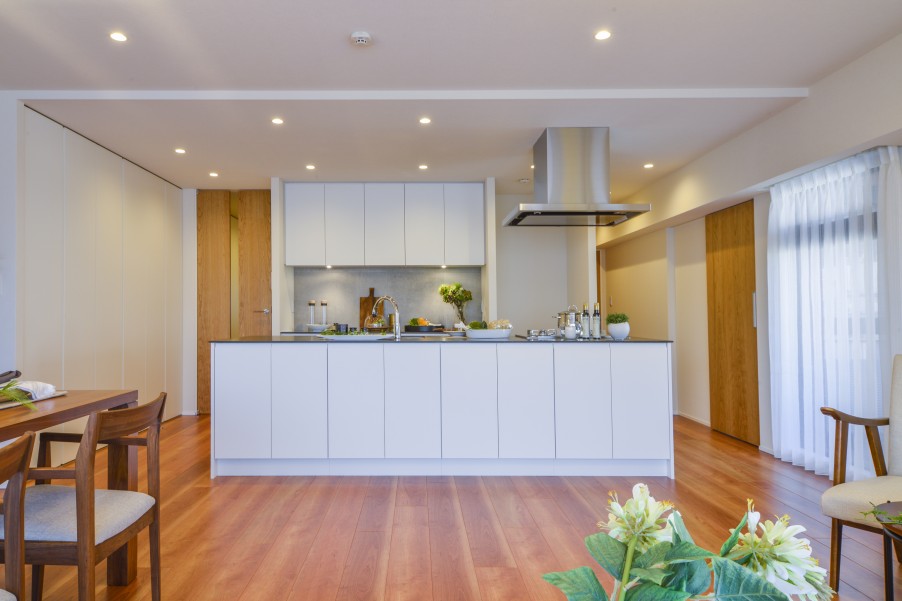 たっぷり約28.6帖のリビングダイニングキッチンにはアイランドキッチンを採用。