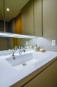 洗面室の洗面台も少し大きめで、洗濯機のそばにはタオル等をしまうことのできる収納。