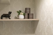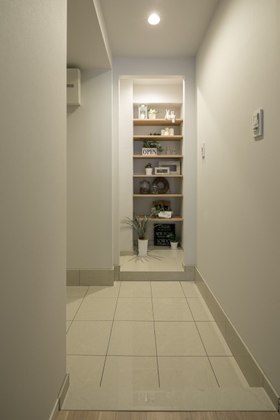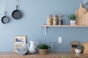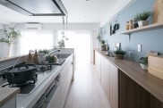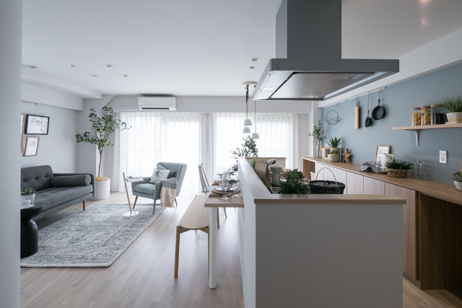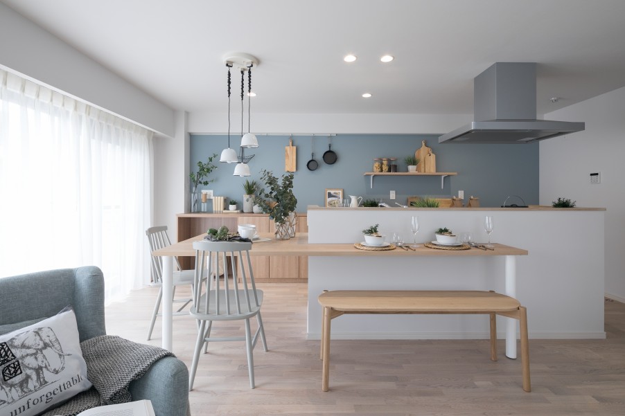 壁一面の淡いブルーはどんな小物にも合うので、置くものを変えて日々楽しんでいただけるかと思います。