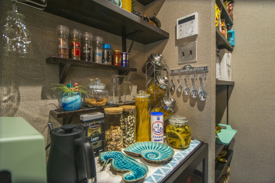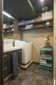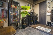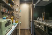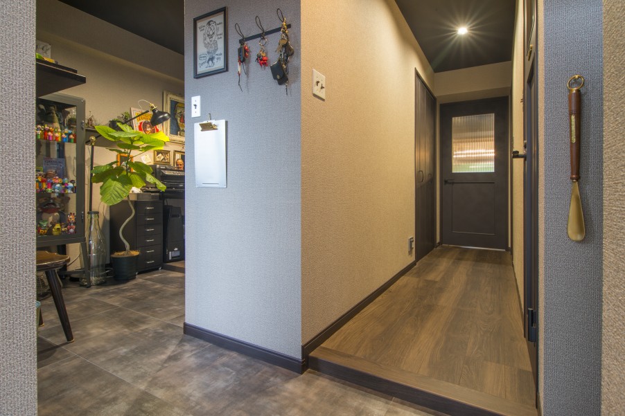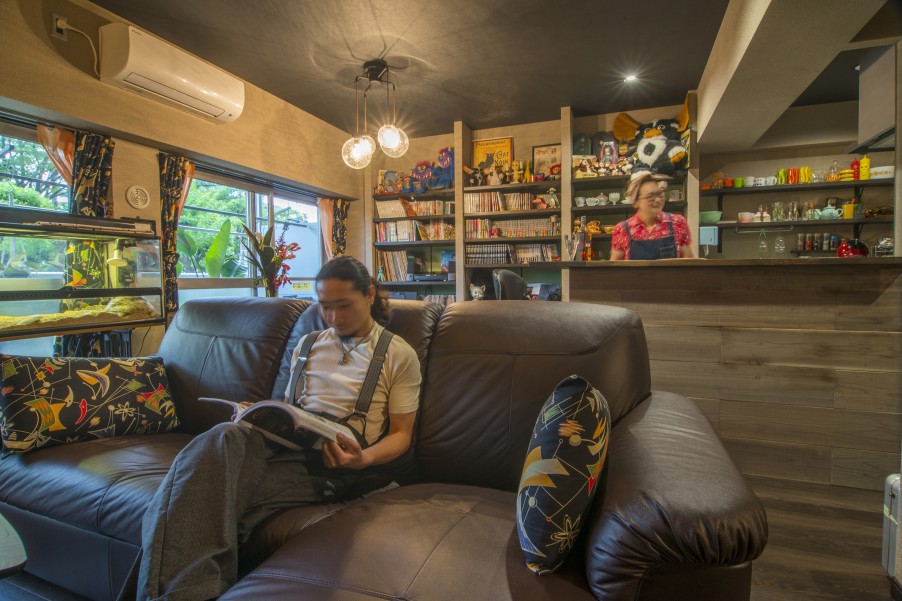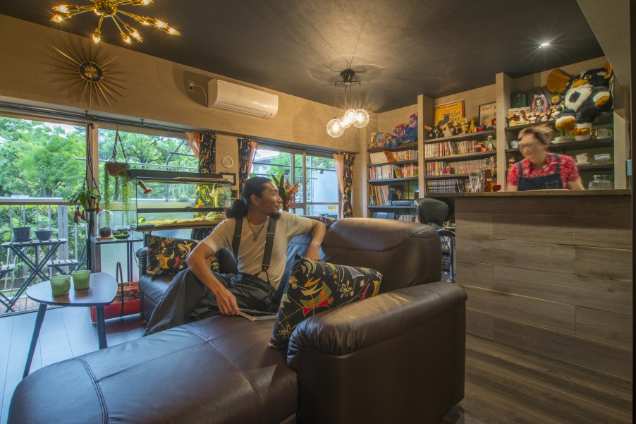 「お店ってオシャレじゃないですか? そんな雰囲気の中で、普段から生活がしたかったんです。本当に理想通りになりました。お気に入りポイントは全部ですが(笑) リビングと寝室の壁をグリーンで揃えたり、柱だけレンガを貼ってもらったり、壁の色にもこだわっています。それと天井を黒にしてもらったことで引き締まっていますよね。他にはあまりない色遣いだと思いますが、イメージ通りです。お気に入りのものを飾るのに、最適な造りになっています」 - 3リノベーション内容+立地の良さで生活機能面が大幅向上「本や小物が多いので、飾れるように棚をたくさん作ってもらいました。玄関を入って、すぐ左側に主人の作業スペースとしてDENを設けたのですが、ここもお気に入りです。設計の方がすごく親身になってくださって、キッチンにはパントリーがある方が便利ですよとか、棚はこんなものがグラスを飾ると映えますよなど、いろいろアドバイスしてくださいました。おかげで本当に暮らしやすいです」