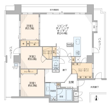 - 二面採光で明るく、約24.4帖の広々としたLDK